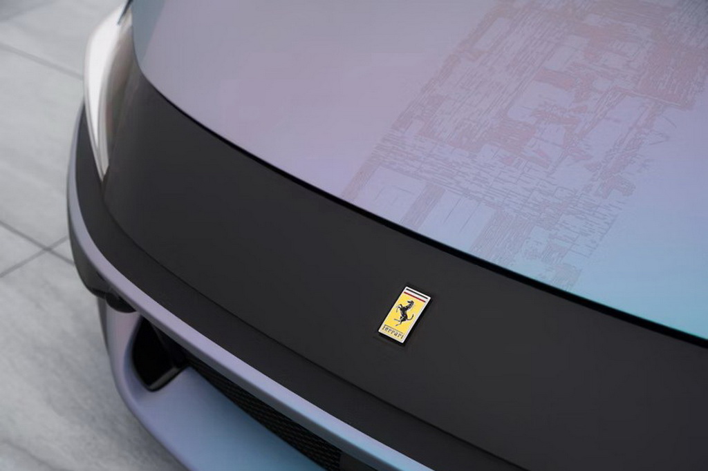 Багаторазова володарка нагород Хенхі Кім застосовує свій характерний напівпрозорий стиль до таких елементів, як емблеми Scuderia Ferrari, кінь, що гарцює, і навіть трансмісійний тунель, створюючи захопливу, казкову атмосферу. Тема доповнюється стриманим використанням білого кольору в окремих елементах інтер’єру та екстер’єру, що є результатом досвіду ТеХон Лі, чиї дослідження в галузі лаку, багатошаровості та трансформації поверхонь лежать в основі таких деталей, як гальмівні супорти та підкермові перемикачі.